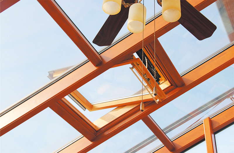 D210鋁包木陽光房使用斜屋頂天窗,解決了夏天太熱的問題,當(dāng)陽光房頂上的天窗打開后,熱氣往上跑出天窗,陽光房外的低溫空氣補充,形成空氣對起到降溫。陽光房天窗,既通風(fēng)又不影響采光,使陽光房感覺寬闊、明亮、高雅,生動靚麗,是陽光房的畫龍點睛般不可缺少的。